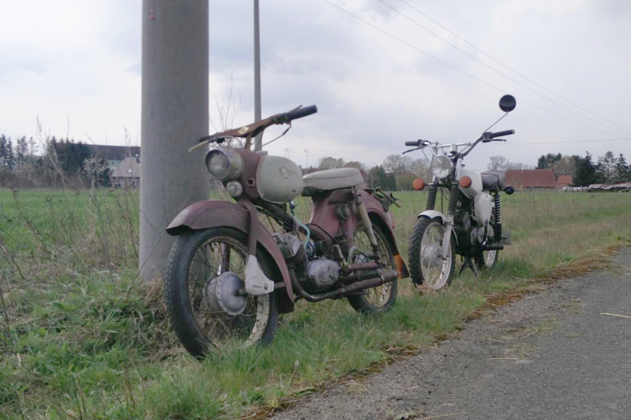 Ein paar Teile wie Seitenbleche, Bremszüge, Kettenschläuche und ein bisschen Kleinkram fehlten. Die Pneumant DDR Reifen können 30 Jahre nach der Wende auch mal ersetzt werden.