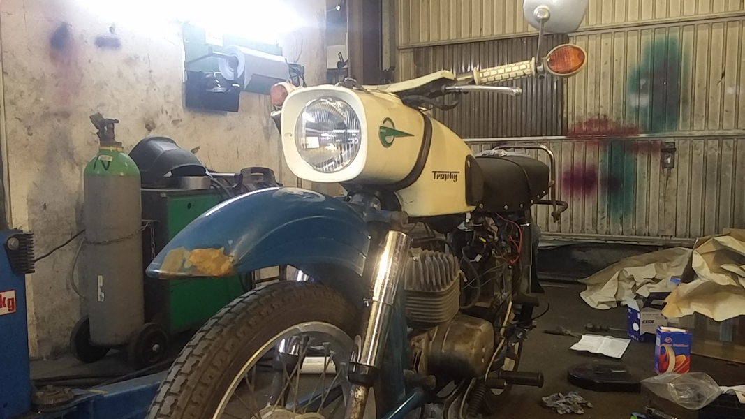 Gekauft wie gesehen und gleich mitgenommen. Es fehlen Scheinwerfer, Spiegel, Benzinhahn, Werkzeugdeckel und Seitendeckel links. Die Elektrik sieht etwas durcheinander, aber gar nicht so verkehrt aus.