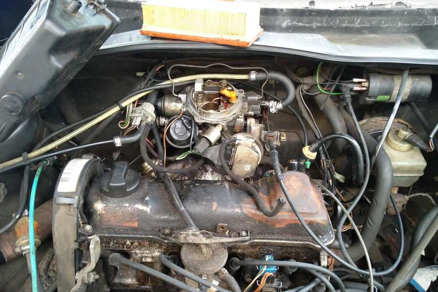 Im Golf steckt der allseits bekannte PN Motor (auch bekannt als PP im Längsformat im Audi 80). Ein 1.6L Motor mit trägen 70PS. Die Gemischanreicherung findet hier in einem elektronisch geregelten Fallstromvergaser vom Hersteller Pierburg statt, dem 2EE. Ansich funktioniert das ganz gut und sparsam, ist aber relativ empfindlich.