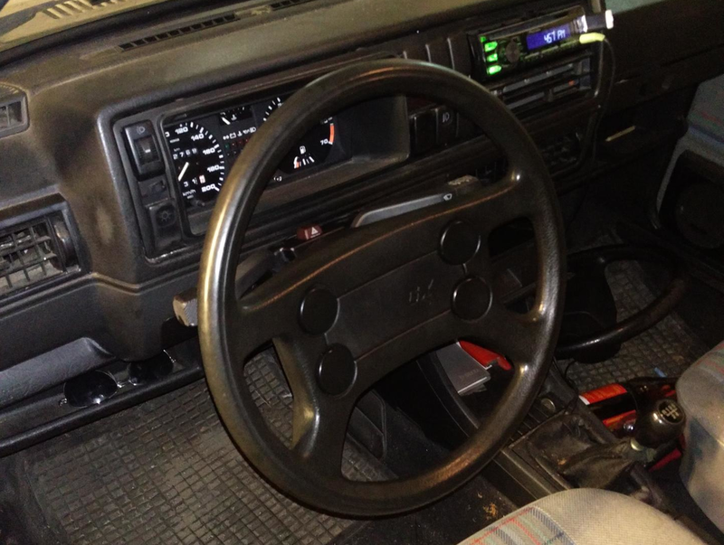 Das 4 Speichen Lenkrad von VW mit den vier Hupknöpfen. Keine Ahnung, ob das Teil jemals im Golf 2 verbaut wurde, ich kenne es hauptsächlich aus dem Golf 1 GTI und dem Scirocco. Meins im speziellen stammt aus einem Golf 1 GX.